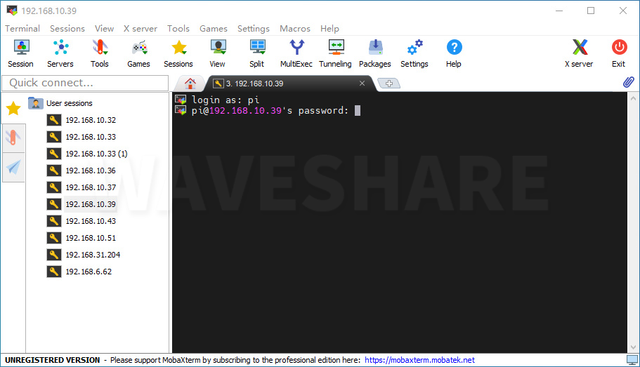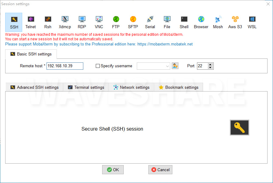 点击session,点击ssh,在Remote host输入树莓派的IP地址: