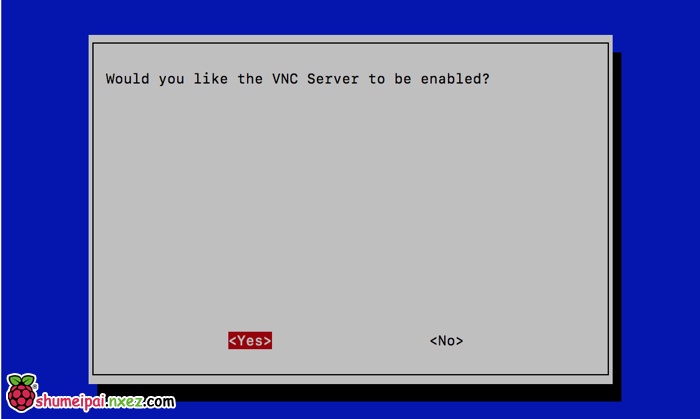 依次操作:Interfacing Options -> VNC -> Yes。之后系统会提示你是否要安装 VNC 服务,