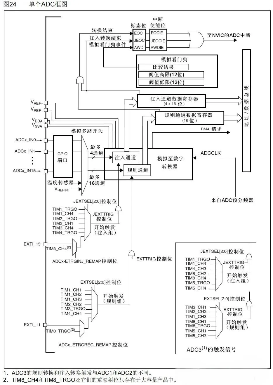 | 注入组: | ADC_ExternalTrigInjecConv_T1_TRGO//TIM1 TRGO ADC_ExternalTrigInjecConv_T1_CC4//TIM1 CH4 ADC_ExternalTrigInjecConv_T2_TRGO//TIM2 TRGO ADC_ExternalTrigInjecConv_T2_CC1//TIM2 CH1 ADC_ExternalTrigInjecConv_T3_CC4//TIM3 CH4 ADC_ExternalTrigInjecConv_T4_TRGO//TIM4 TRGO ADC_ExternalTrigInjecConv_Ext_IT15_TIM8_CC4//EXTI15和TIM8 CH4 |