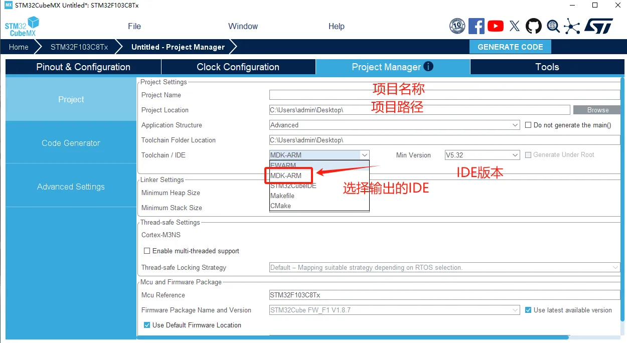然后修改要输出的IDE (MDK-ARM一般就是KEIL)版本号一般默认就好