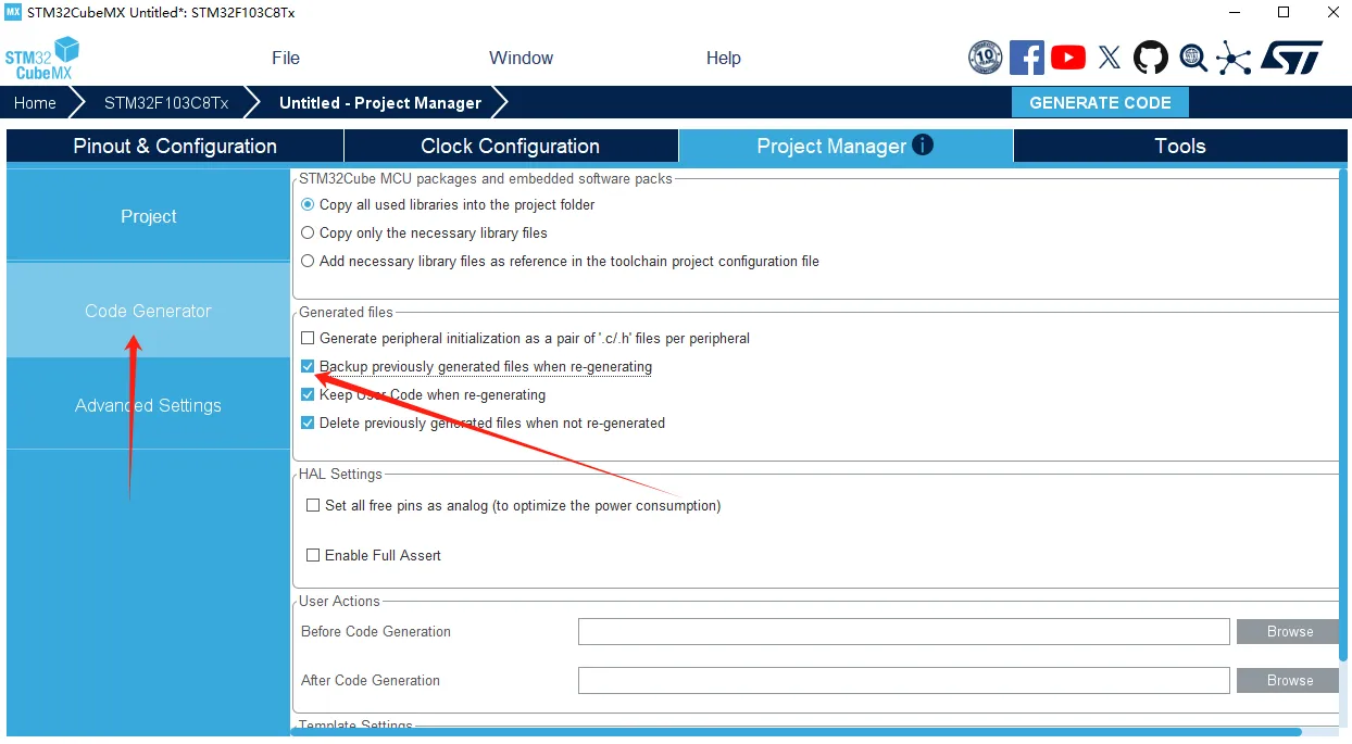 | HAL Settings | Set all free pins as analog可降低功耗,Enable Full Assert用于调试时的断言检查,开发阶段建议按需开启 |