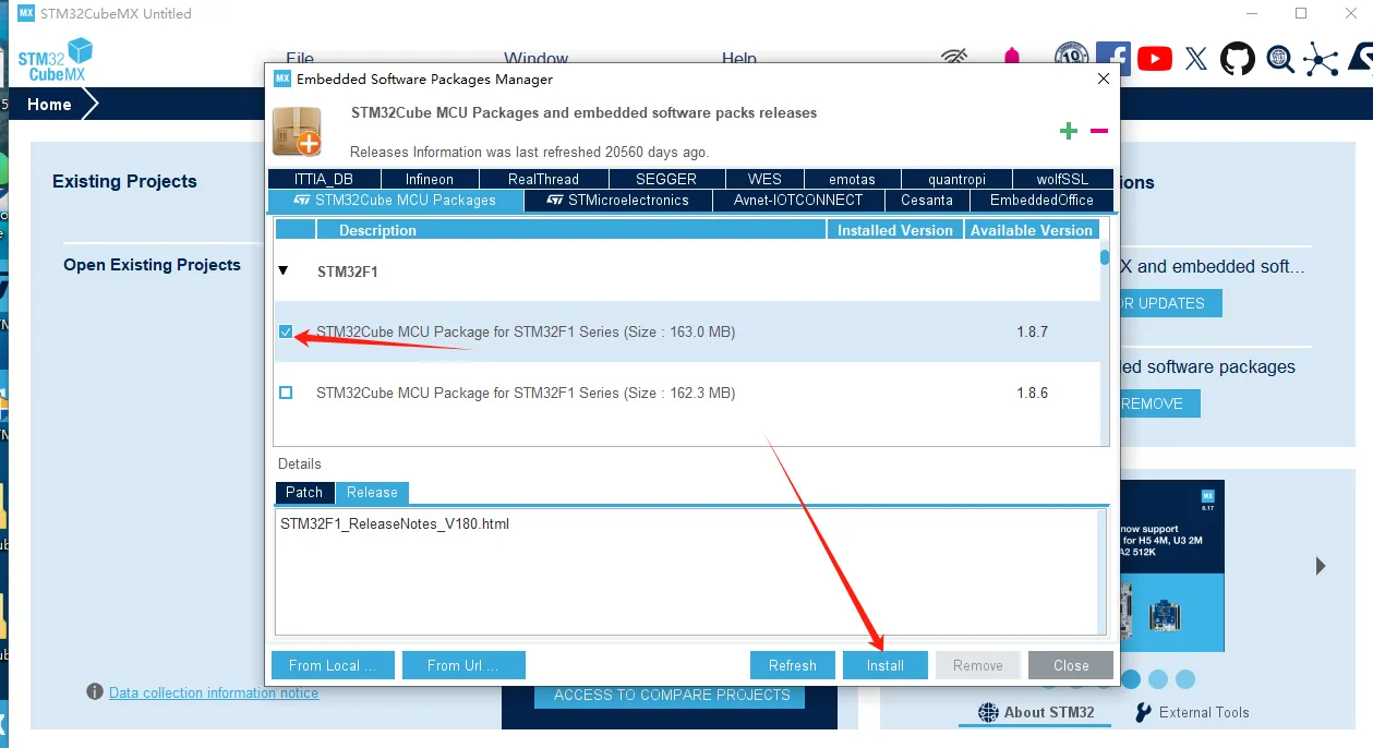 | Firmware Package | STM32Cube FW_F1 V1.8.7 | F1 系列的 HAL 库版本,勾选了 Use latest available version,会自动用最新版库 |